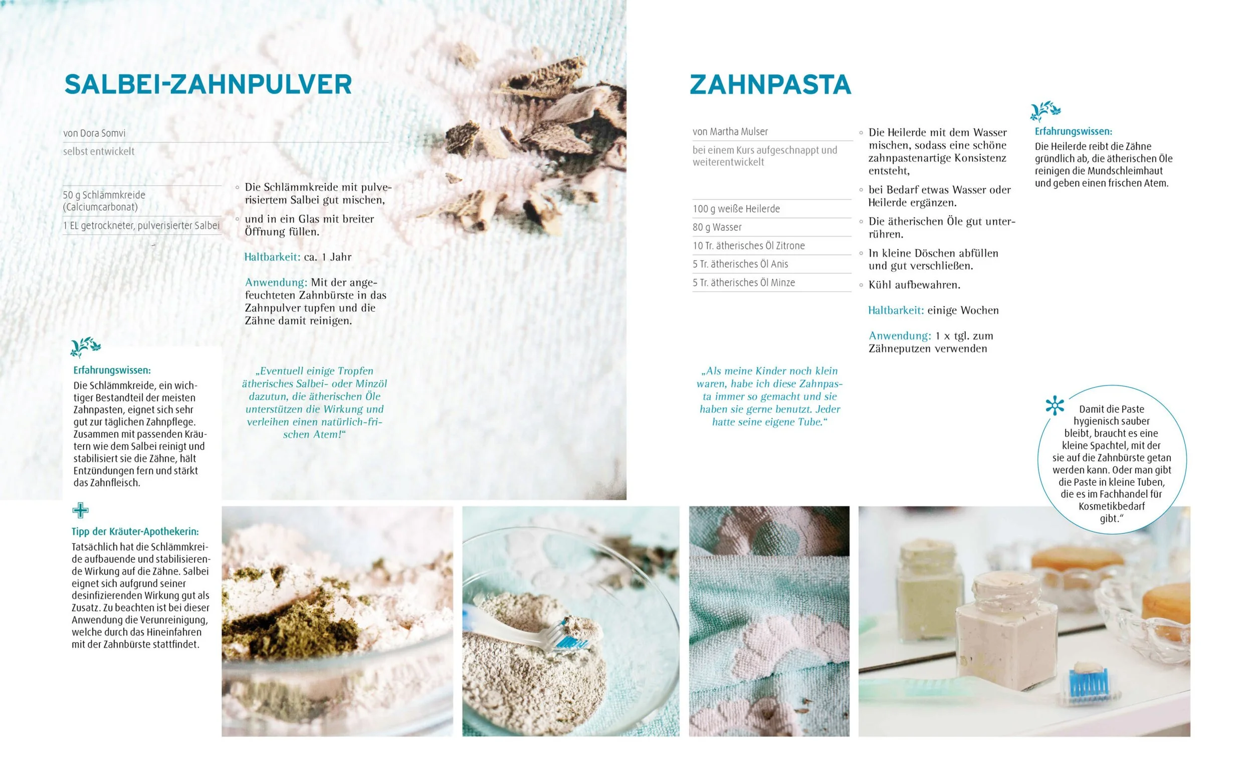 Von Erkältungstee, Kräuterbitter und Löwenzahnhonig über Hustensirup mit Isländisch Moos, Salbeizuckerln, Beinwelltinktur zum Einreiben, Arnikaöl für die Gelenke und Heublumenkissen für einen gesunden Schlaf zu Kamillensalbe und Kräuter-Badesalz; von Edelweiß-Feuchtigkeitscreme, Petersilien-Gesichtswasser und Brennnessel-Haarglanzspülung über Wildkräuterlimonade, Ringelblumenbutter und Fichtensprossentiramisu zu Raumsprays, Räuchermischungen und Putzmittel mit Zinnkraut – wir haben alle Rezepte selbst erprobt und so übersichtlich beschrieben, dass auch Anfängerinnen und Anfänger sie ganz einfach zubereiten können. Überprüft wurden sie außerdem von einer Apothekerin.
